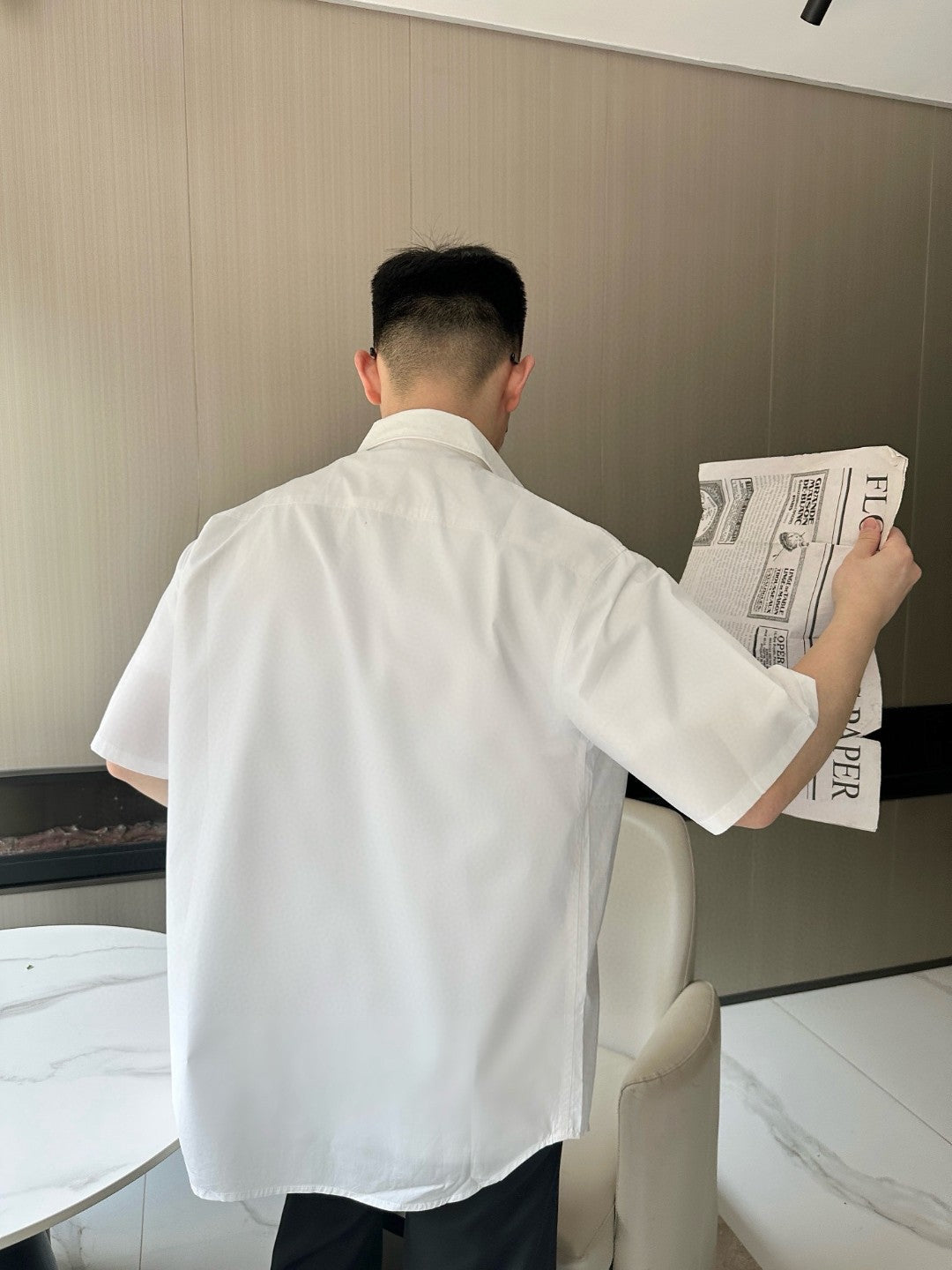 This white Prada short-sleeve button-up shirt combines classic design with modern elements. The shirt features a clean and crisp look, enhanced by a front chest pocket adorned with the signature Prada triangle logo. The button-up style is complemented by a small, subtle loop detail near the pocket, adding a unique touch to this otherwise minimalist piece. Crafted from high-quality materials, this shirt ensures comfort and durability, making it a versatile addition to any sophisticated wardrobe. Ideal for both casual and semi-formal occasions, this Prada shirt exemplifies timeless elegance with a contemporary twist.