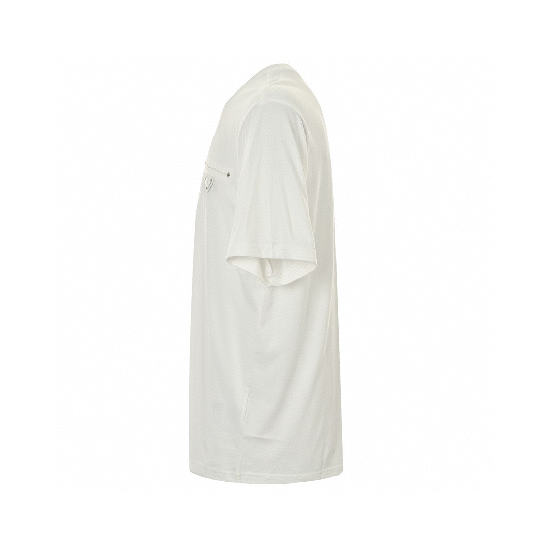 This Prada t-shirt features a minimalist white design. It has a small chest pocket with a zipper, adorned with the iconic Prada triangle logo. The clean lines and simple aesthetic make it perfect for a modern, refined look. Ideal for both casual and semi-formal occasions.
