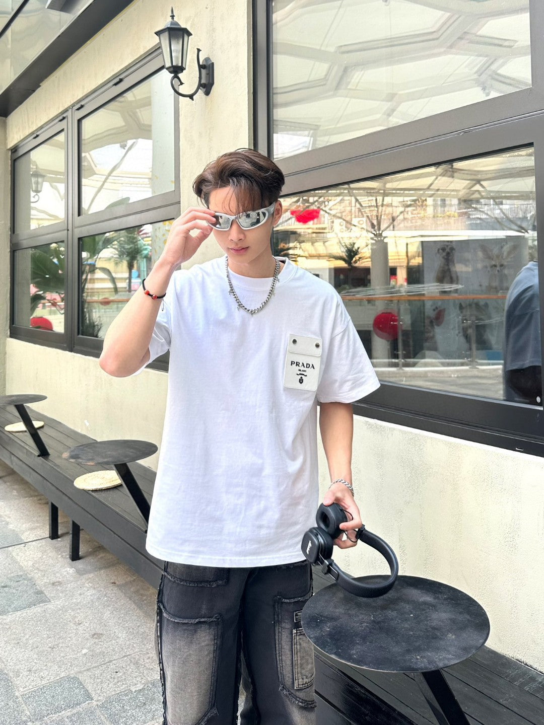 This Prada t-shirt features a minimalist design with a distinctive pocket detail on the front. The white fabric provides a clean, classic look, while the small pocket includes the Prada logo and Milano text, adding a touch of elegance and functionality. Perfect for those who appreciate understated luxury in their casual wardrobe.