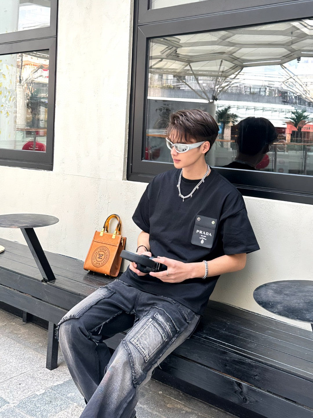 This Prada t-shirt features a minimalist design with a distinctive pocket detail on the front. The black fabric provides a sleek, modern look, while the small pocket includes the Prada logo and Milano text, adding a touch of elegance and functionality. Perfect for those who appreciate understated luxury in their casual wardrobe.