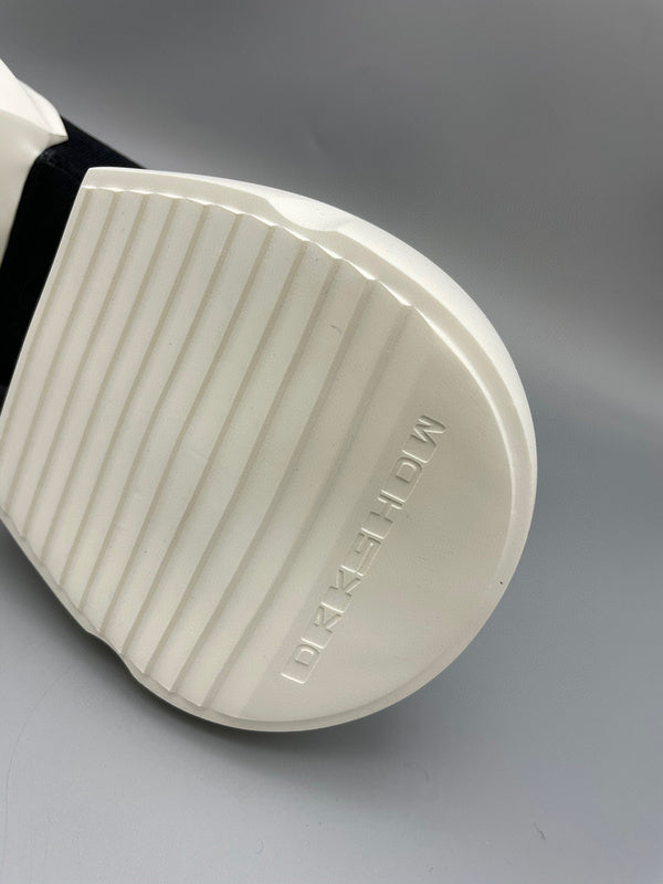 These high-top sneakers feature a sleek black upper, made from durable canvas material. The standout feature of these sneakers is the chunky, exaggerated white platform sole, which adds a dramatic flair and sets these shoes apart from conventional designs. The unique silhouette and bold contrast between the black upper and white sole embody Rick Owens' avant-garde style, making these sneakers a must-have for fashion-forward individuals.