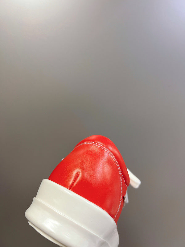 Introducing the Rick Owens Low-Top Sneakers in bold red leather, a dynamic addition to any footwear collection. These sneakers capture the essence of Rick Owens' avant-garde style while offering unparalleled comfort and durability.