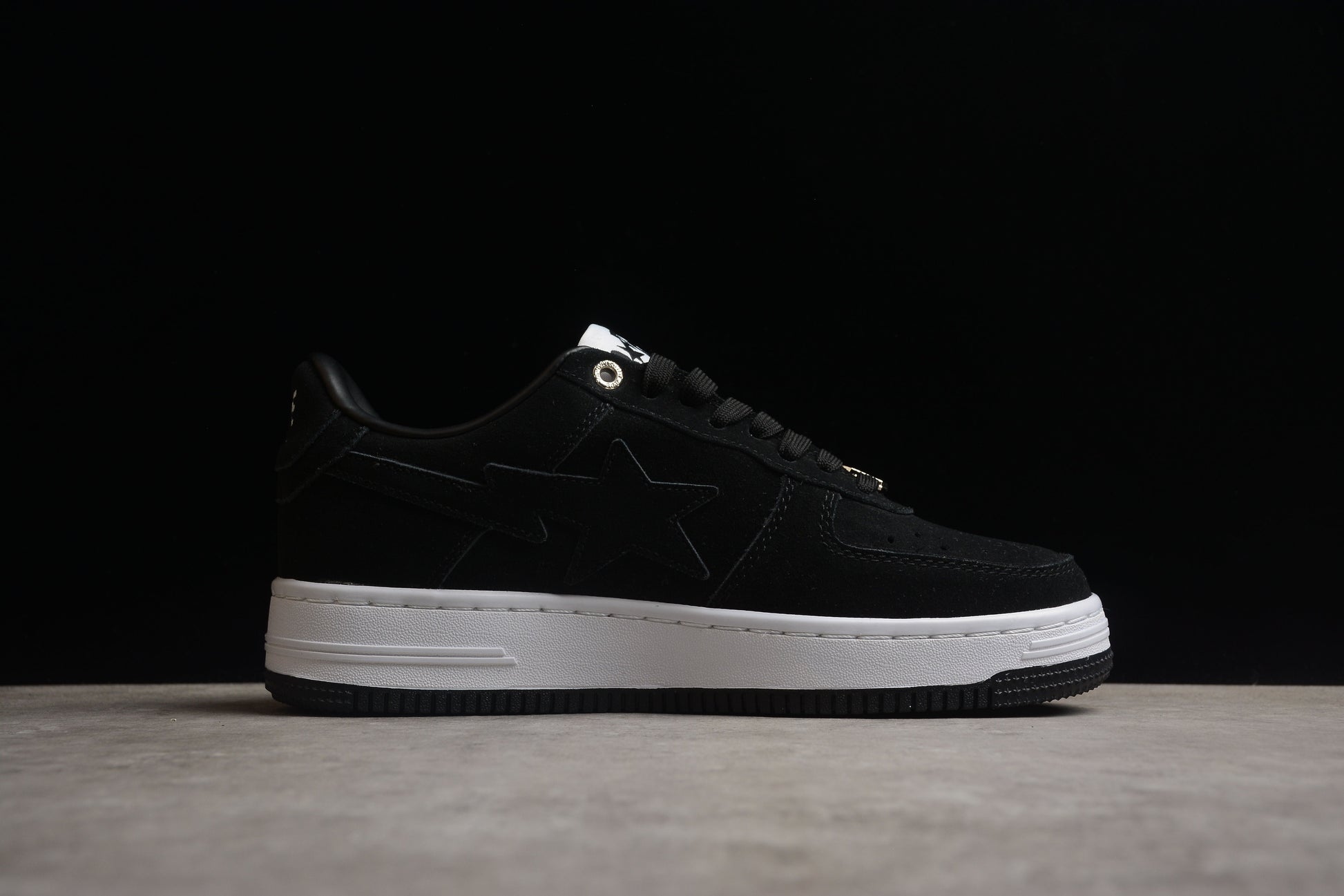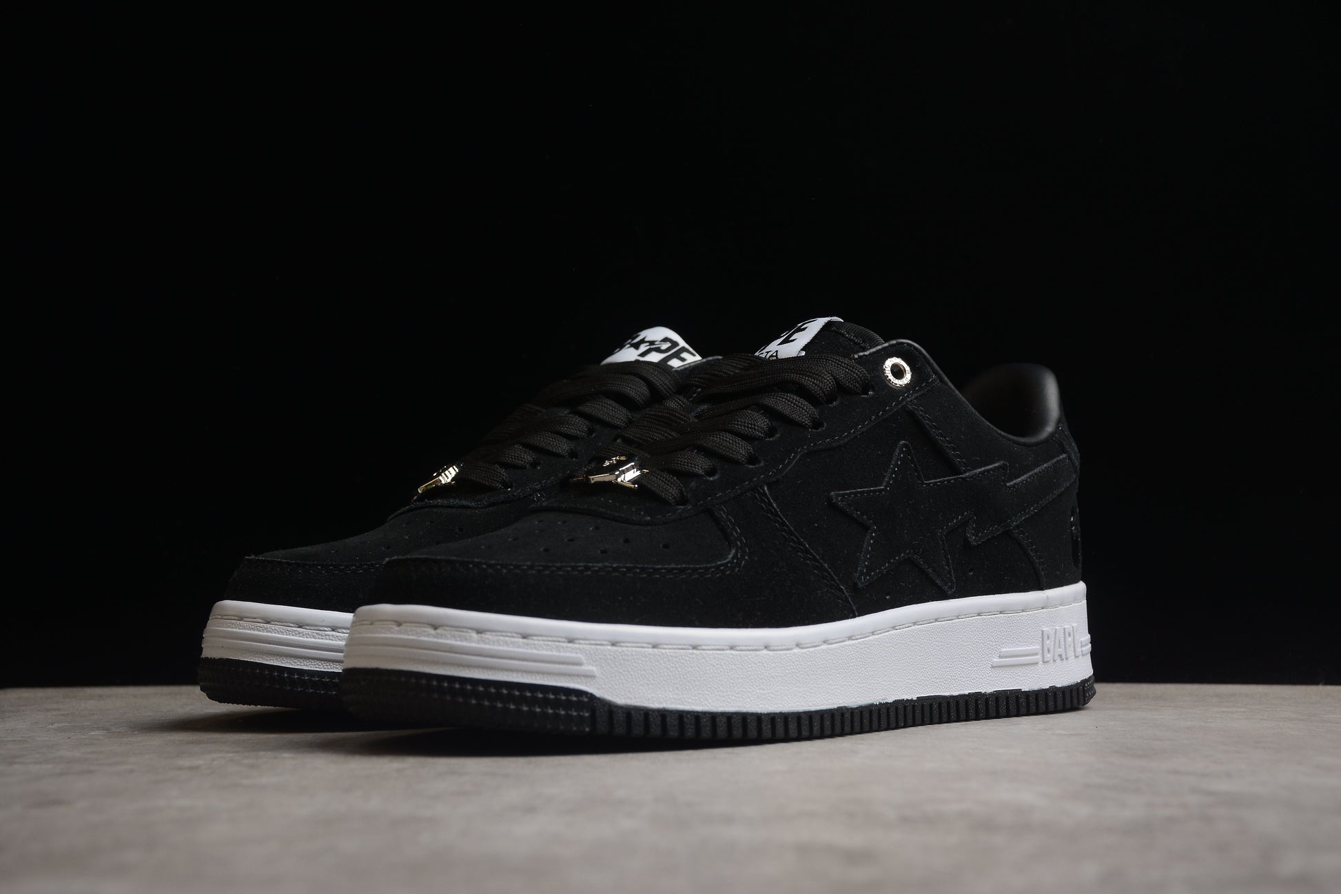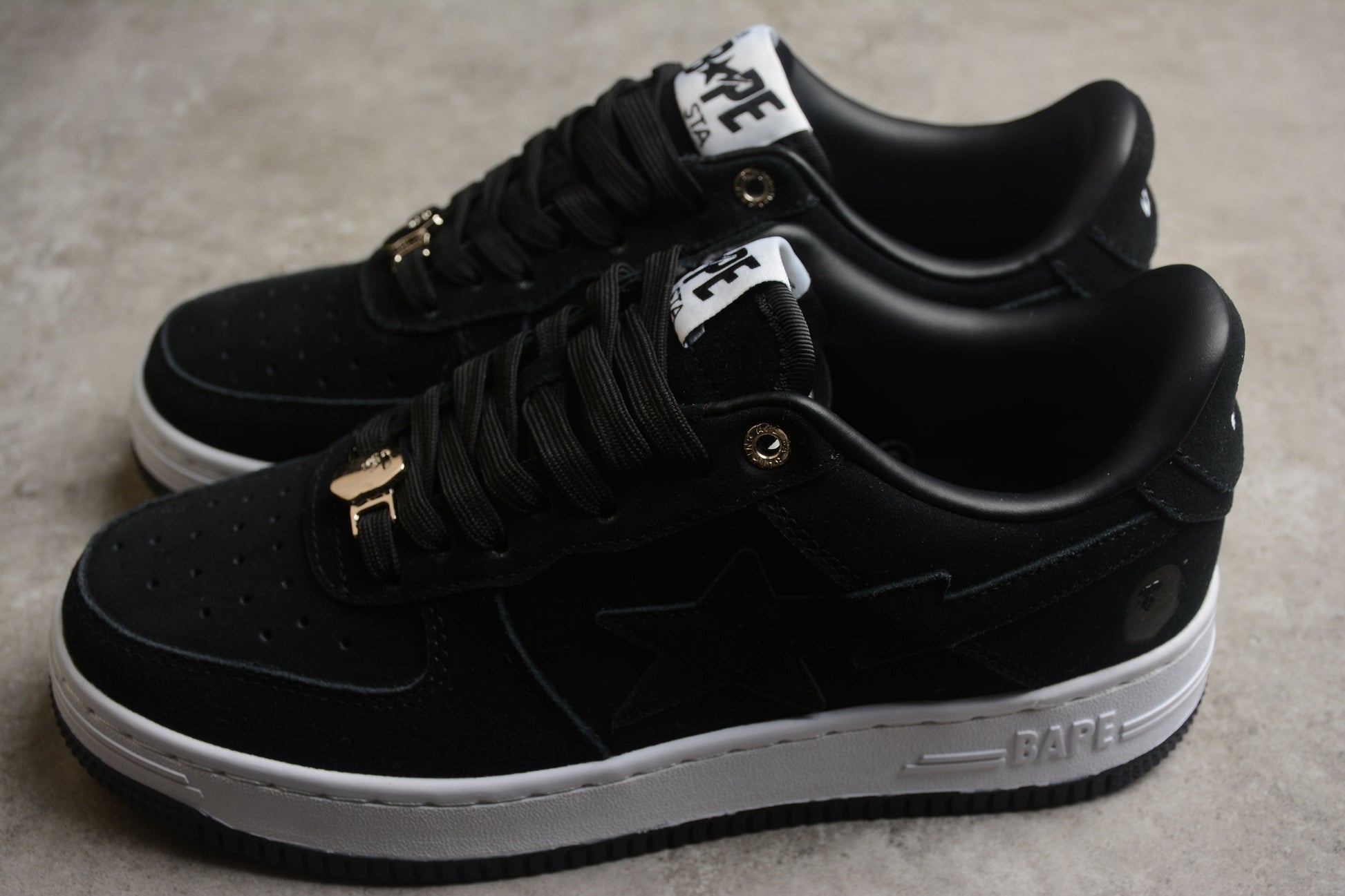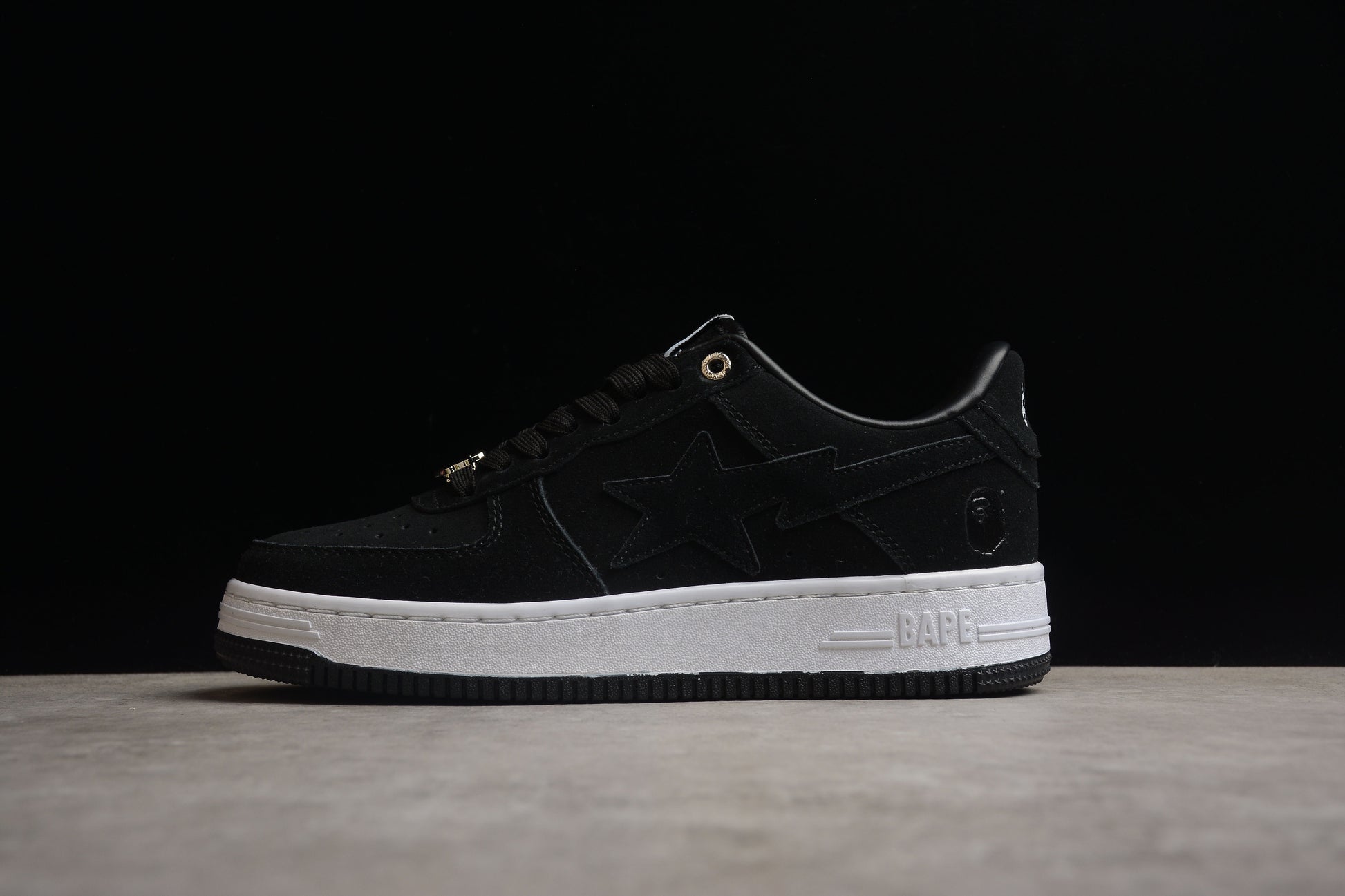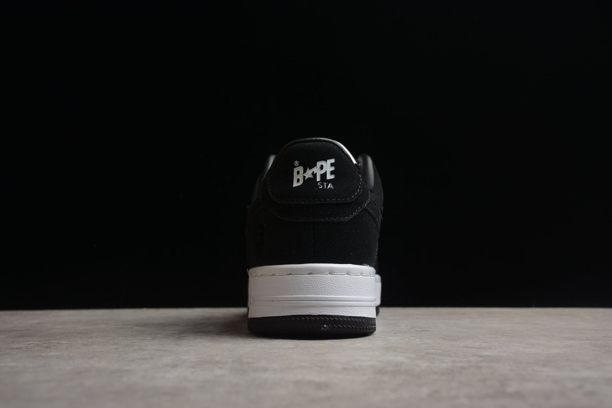 These sneakers feature a sleek black suede upper, offering a rich texture and a sophisticated look. The iconic BAPE STA star logo is subtly embossed on the side panels, maintaining the brand's distinctive identity. The black colorway is contrasted by a clean white midsole, adding a touch of classic appeal to the modern design. The premium suede material not only enhances the visual appeal but also ensures durability and comfort.
