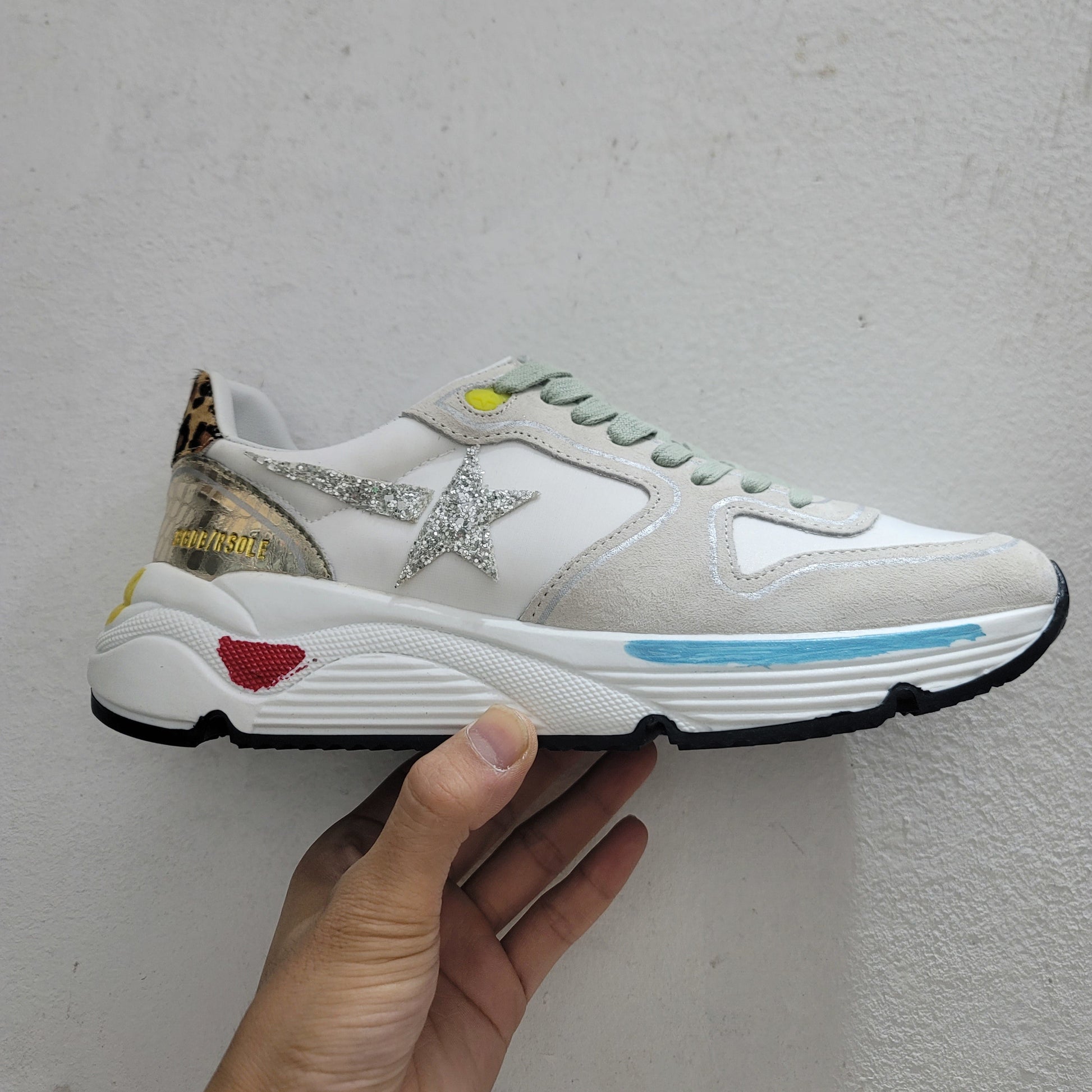 A true statement-maker, these Running Sole sneakers combine unexpected textures and colors for a unique, eye-catching finish. The white mesh and suede upper is accented by a sparkling silver glitter star and pastel green laces. A faux croc-effect panel at the heel, bright neon detailing on the midsole, and a leopard-print back collar add playful contrast and luxury edge. With a chunky sole and urban attitude, these shoes fuse fashion and function for the bold modern woman.