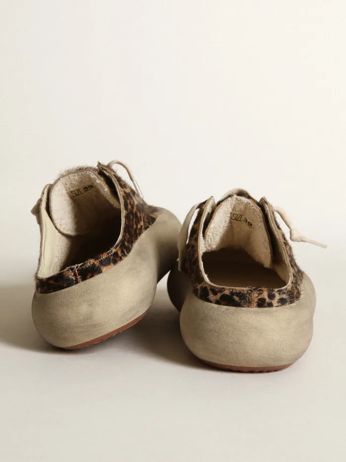 Unapologetically bold and effortlessly comfortable, these Golden Goose Space-Star Mule Sneakers in leopard print deliver standout flair with an easygoing attitude. Designed with a slip-on mule silhouette, the upper features a plush faux leopard pattern paired with a contrasting black star patch for added edge. The distressed midsole brings that iconic Golden Goose worn-in look, making each pair uniquely yours. Ideal for casual days, errands, or styling up a neutral outfit, these mules are the epitome of everyday statement footwear.