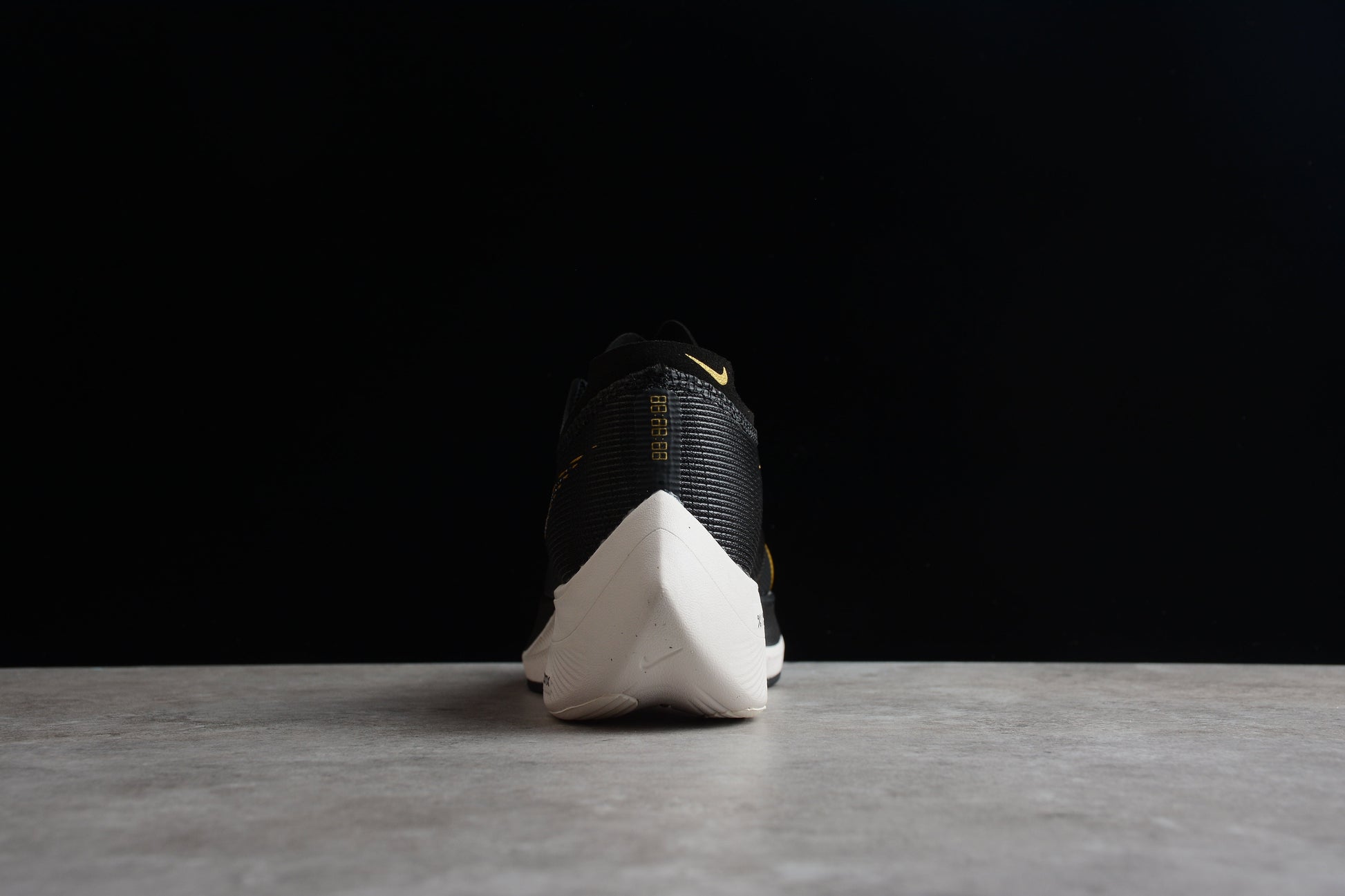 The Nike ZoomX Vaporfly NEXT% 2 is engineered for runners who demand top-notch performance and sleek design. This model features a sophisticated black upper with subtle gold and white accents, providing a stylish yet understated look.