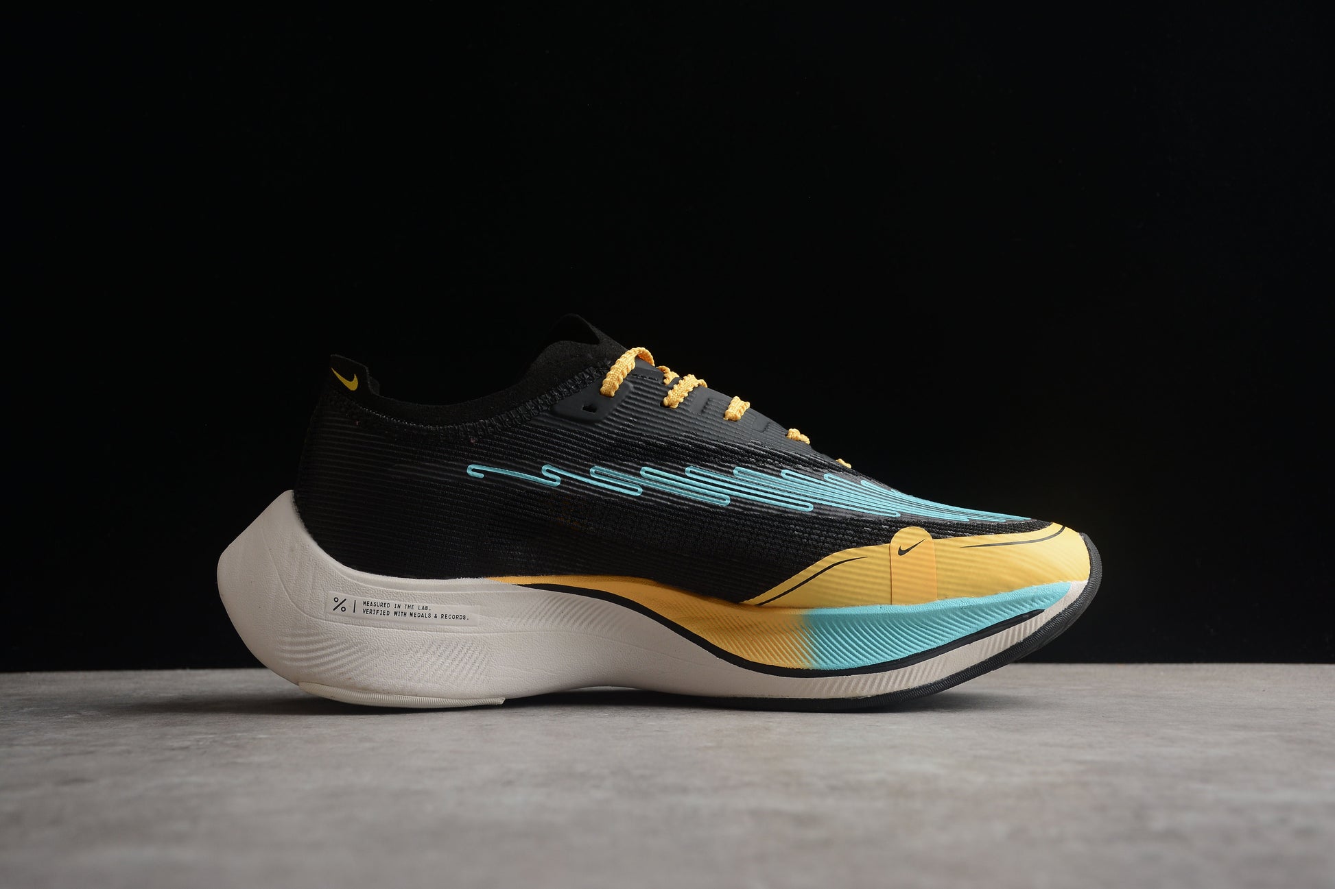 Introducing the Nike Air Zoom Alphafly NEXT% 2, a revolutionary running shoe designed for those who seek to break records and achieve personal bests. This model features a dynamic black, yellow, and turquoise colorway that stands out with its vibrant and bold design, perfect for both performance and style.