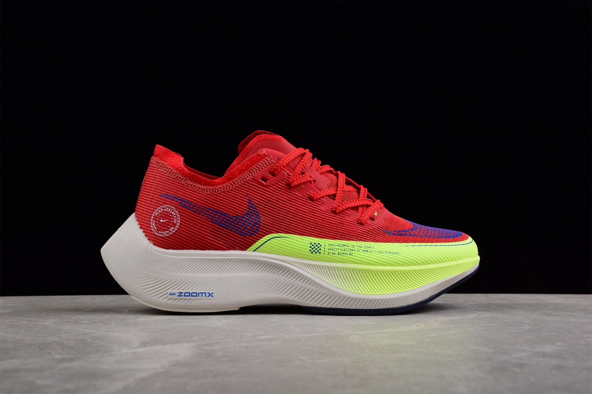 The Nike ZoomX Vaporfly NEXT% 2 is designed for elite runners who demand peak performance and vibrant style. This model features a striking red upper with contrasting neon green and blue accents, making it a standout choice for race day.